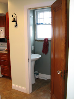 The bathroom is now where the old kitchen sink was and it takes up less space (but you don't have to be super-skinny to use it). We are still working on the finishing touches (crown molding being one of them); more pictures to come.